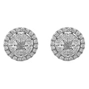 18kt white gold invisible set marquise and princess cut diamond earring with micro prong set round brilliant diamond removable halo.