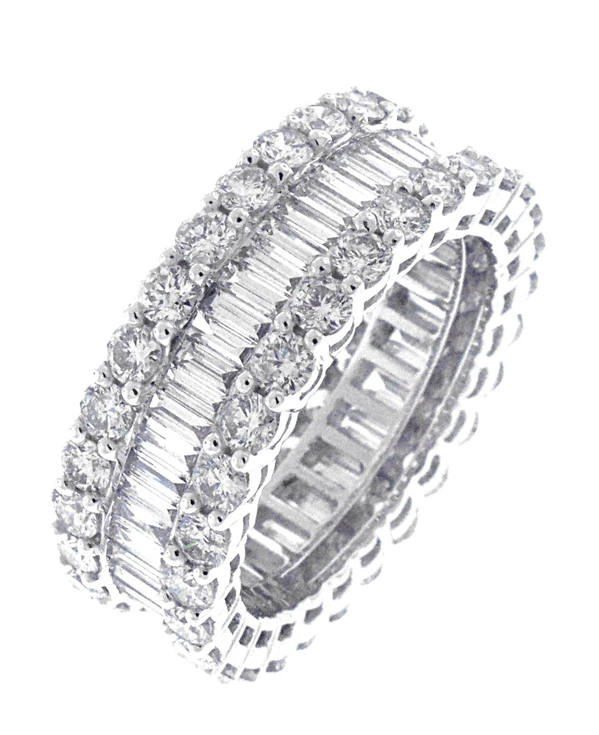18kt white gold channel set baguette diamond and mutual prong set round brilliant diamond eternity band.