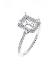 Set into an 18kt white gold micro prong set round brilliant diamond emerald halo semi mount.