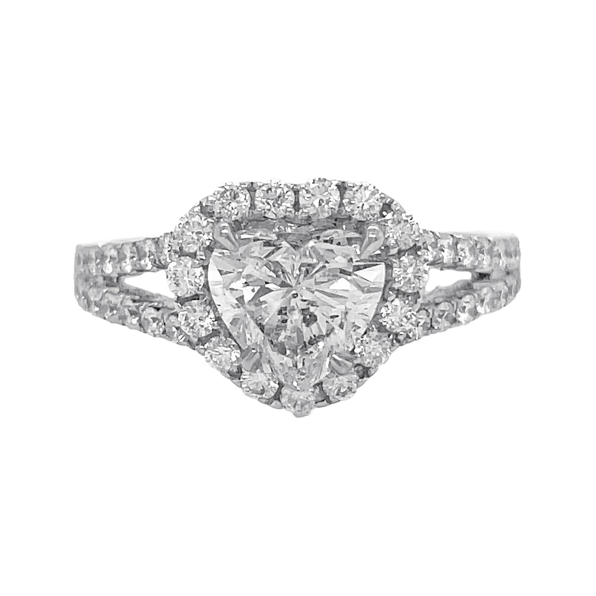 18kt white gold micro prong set round brilliant diamond heart shape semi mount with a split shank and a heart shape diamond set into center