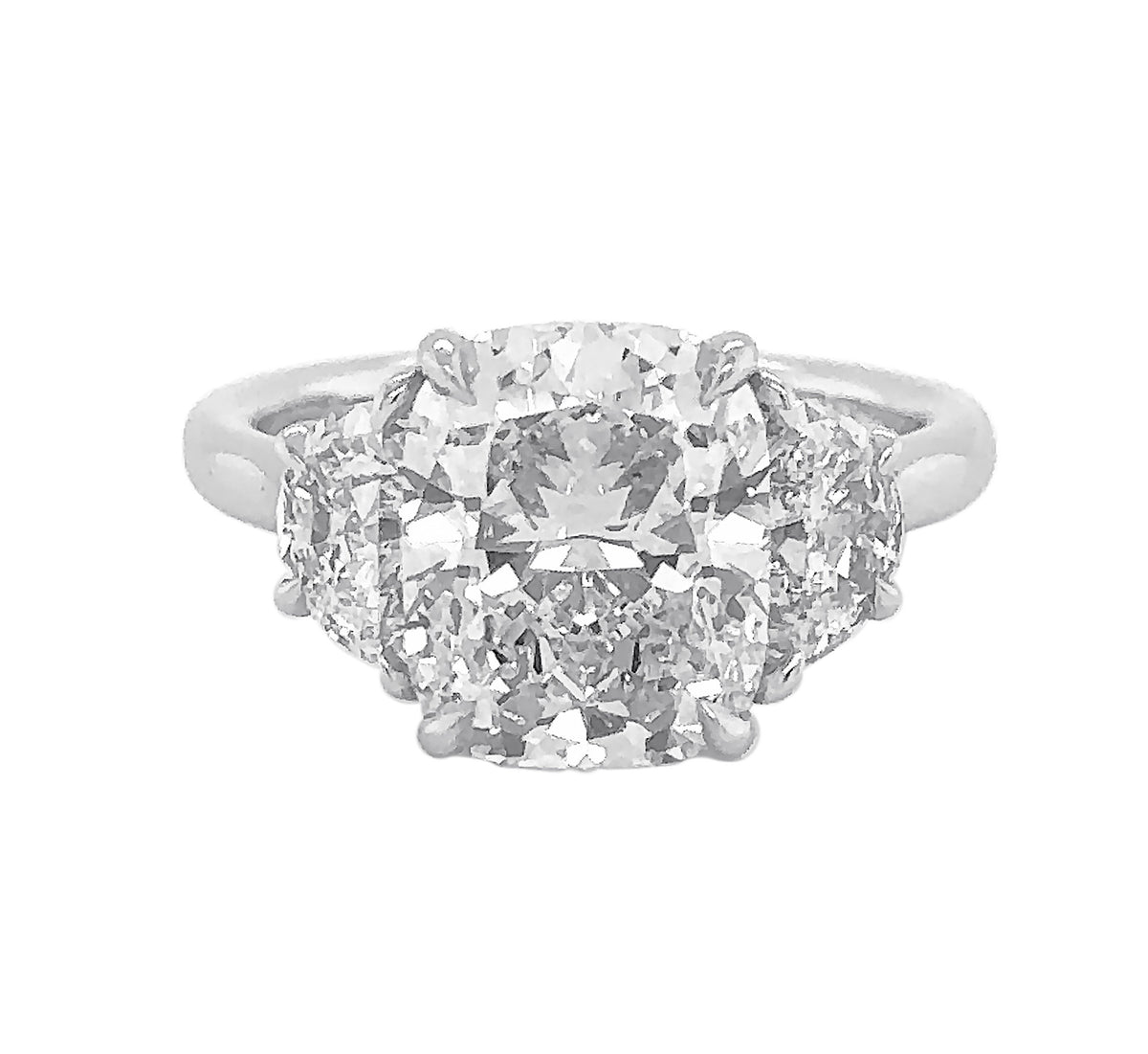 18kt white gold 4 prong set GIA certified laboratory grown cushion modified brilliant diamond ring with prong set half-moon diamond on each side.