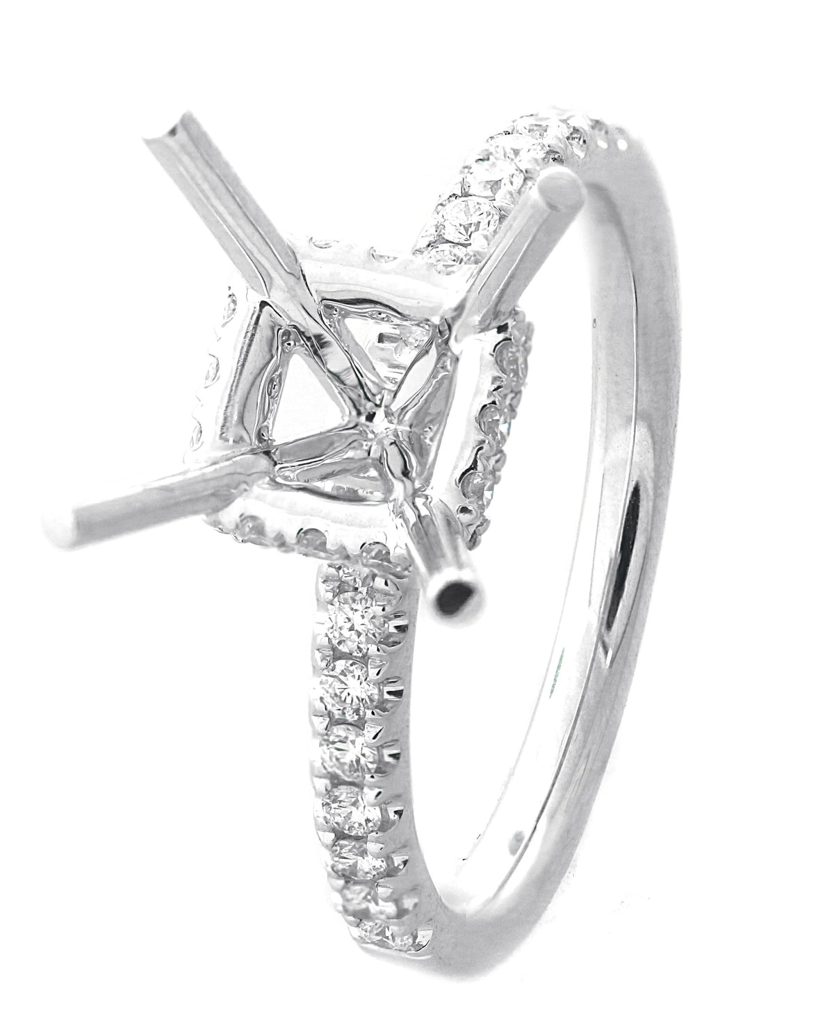 18kt white gold micro prong set round brilliant diamond semi mount for cushion with under halo