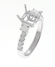 18kt white gold micro prong set round brilliant diamond semi mount with prong set trapezoid on side.