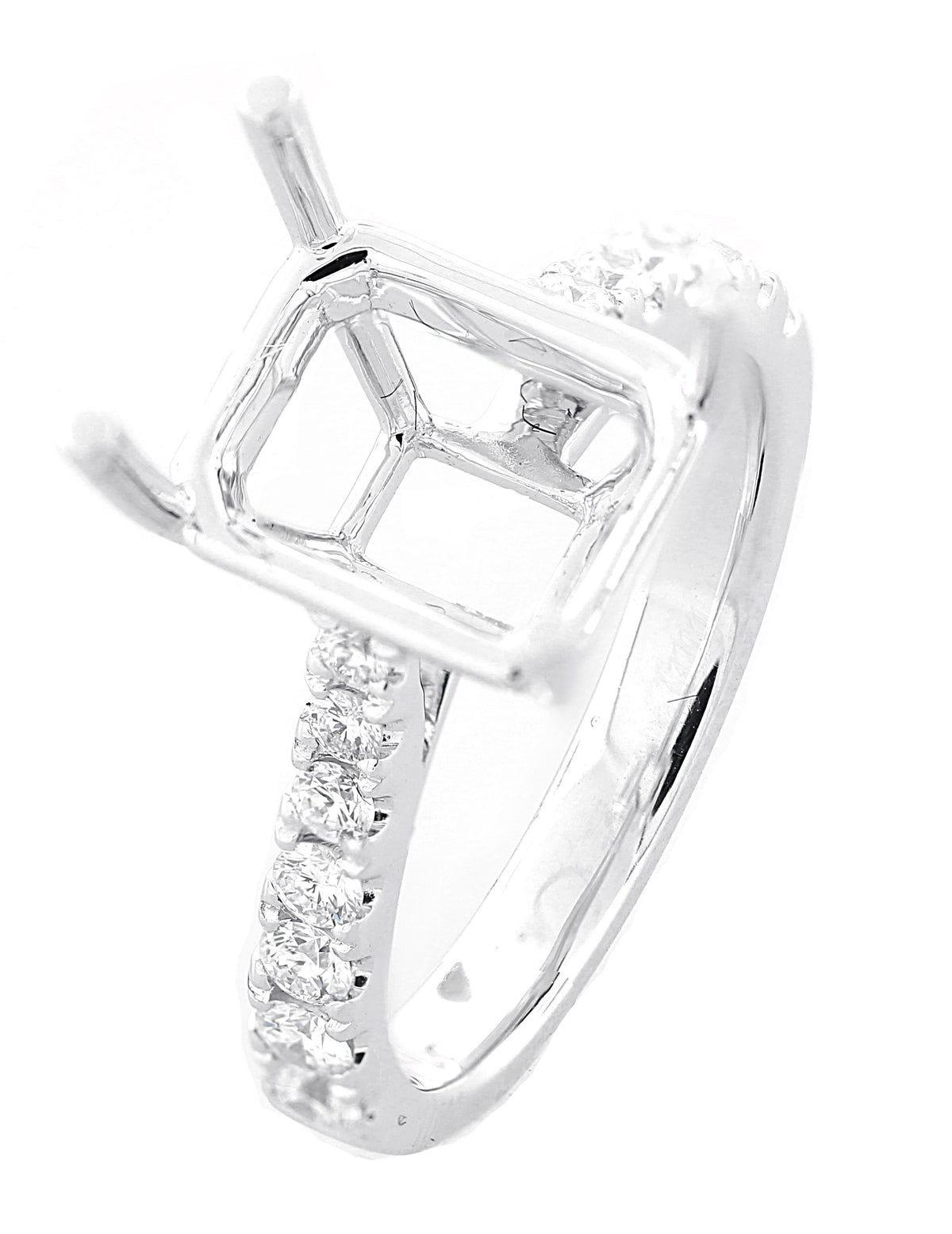 18kt white gold micro prong set round brilliant diamond semi mount for a radiant cut stones