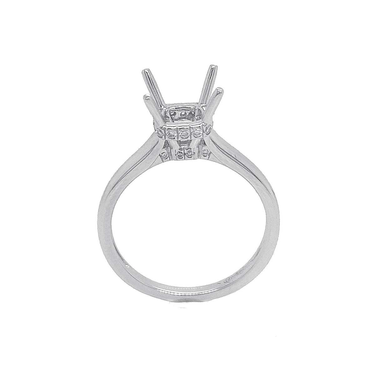 18kt white gold 4 prong semi-mount with micro prong set round brilliant diamonds on gallery.