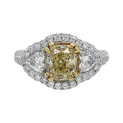 18kt White gold prong set GIA Certified Fancy Yellow Cushion Cut Diamond and prong set heart shape diamonds on each side with micro pave set round brilliant diamond halo ring.