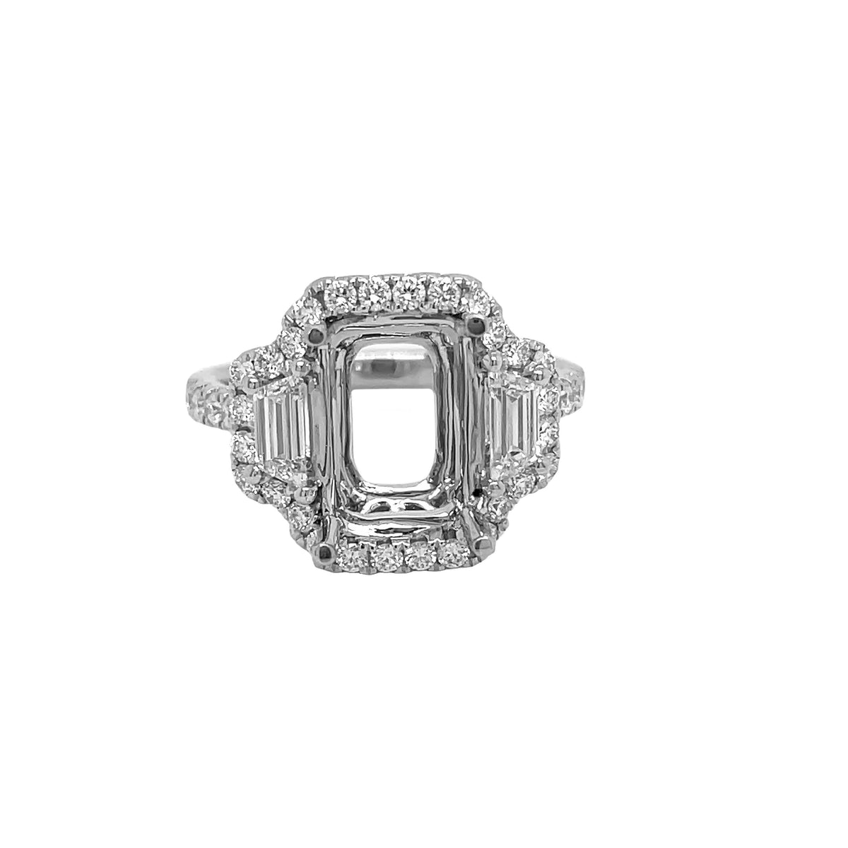 Platinum 4 prong set trapazoid diamond 3-stone semi-mount with micro prong set round brilliant diamond halo.